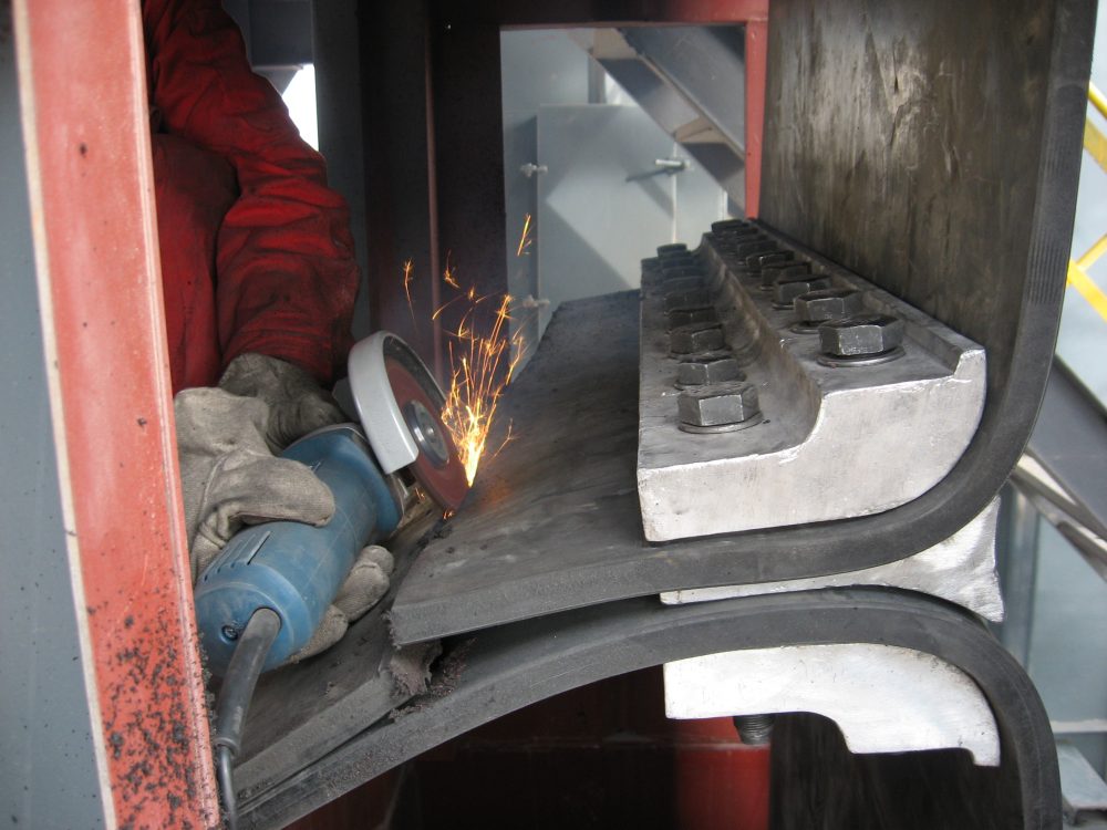 斗提升機(jī)輸送帶為條帶狀結(jié)構(gòu),裝配時需要采用夾具,將膠帶的兩個端部連接固定成為環(huán)狀,實(shí)現(xiàn)在滾筒帶動下連續(xù)運(yùn)行。